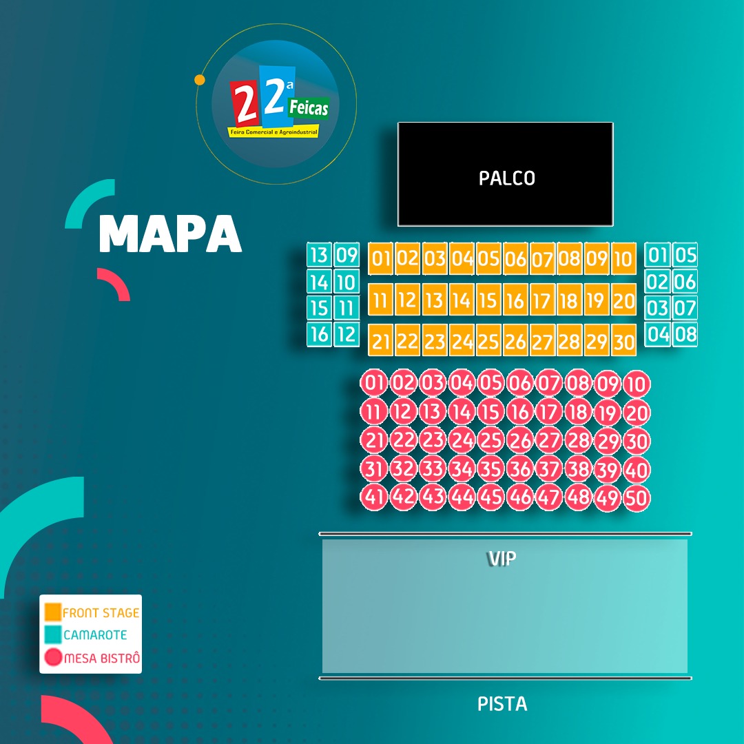 Confira ao lado o mapa da arena de shows da 22ª FEICAS.